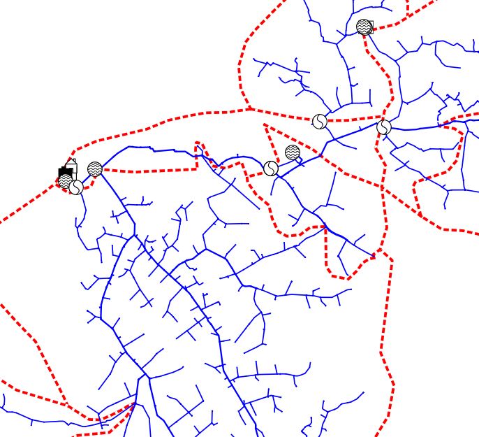 Plan d'implantation des poteaux incendie du Syndicat Intercommunal d’Irrigation de la Région de Forcalquier (SIIRF). D'autres données du réseau du SIIRF comprennent la position des stations de pompage, des réservoirs ainsi que le linéaire topologique. Les 8 communes adhérentes sont : Dauphin, Forcalquier, Mane, Niozelles, Pierrerue, Saint-Maime, Saint-Michel l’Observatoire, Sigonce.